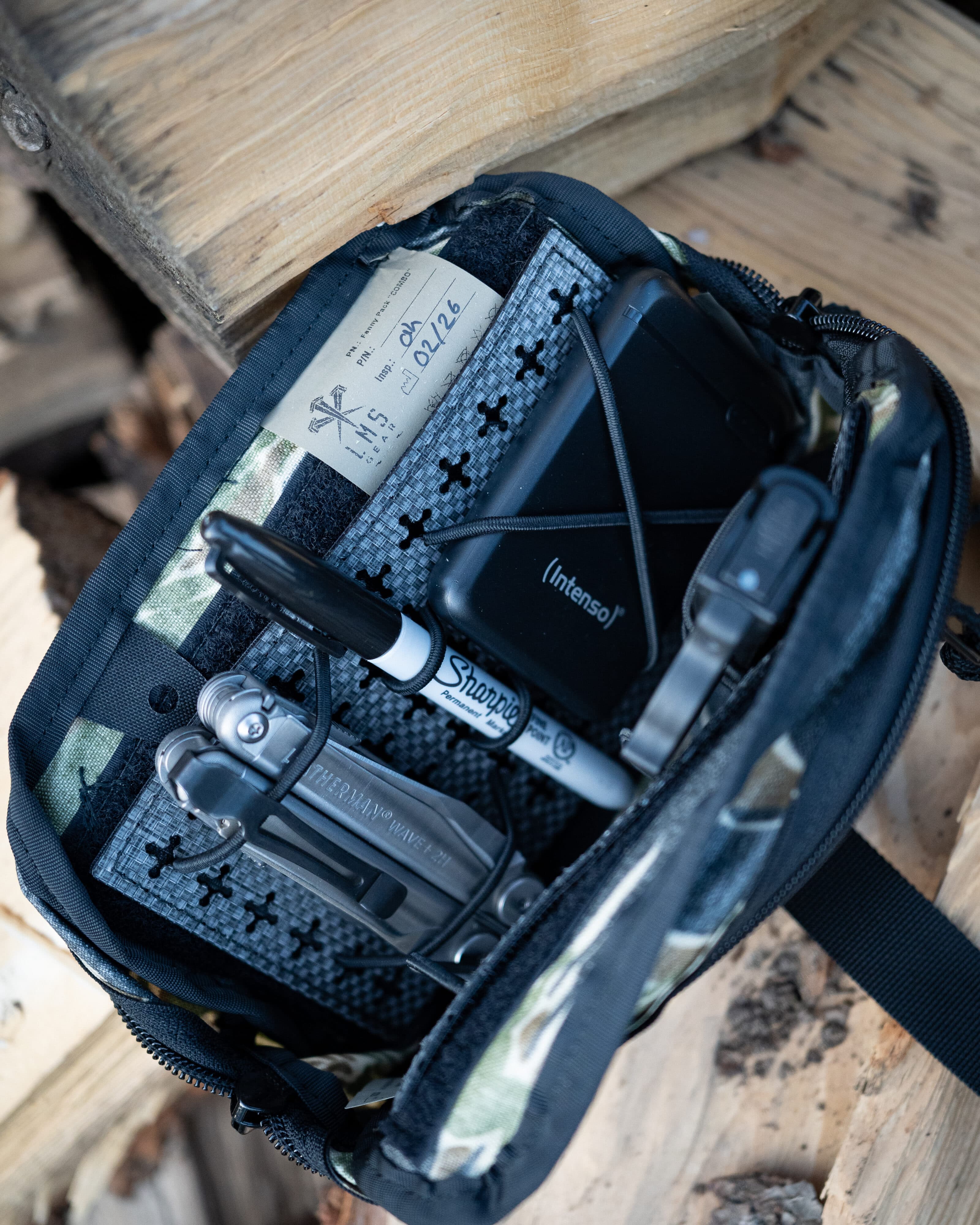 Im Inneren der grossen Tasche ist auf beiden Seiten Velcro Flausch verarbeitet, damit die Tasche individuell auf alle Bedürfnisse angepasst werden kann. Dazu wird ein Tegris Klett Insert mit 80 cm Shockcord mitgeliefert, das genau auf das Fanny Pack zugeschnitten ist. Auf diesem lassen sich diverse Befestigungsmöglichkeiten selbst konfigurieren. Auch passen auf den innen vernähten Flauschklett Organizer Inserts anderer Hersteller.